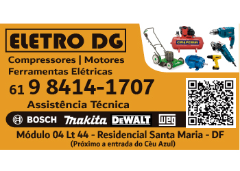 Bem-vindo à página oficial da Eletro DG, a sua parceira de confiança em soluções para compressores, motores e ferramentas elétricas em Santa Maria, no Distrito Federal. Entendemos que a qualidade e a funcionalidade de suas ferramentas e equipamentos são essenciais para o seu trabalho, seja ele profissional ou hobby. Por isso, a Eletro DG se dedica a oferecer um serviço completo, que vai desde a venda de produtos de alta qualidade até a assistência técnica especializada das melhores marcas do mercado. Se você busca um lugar onde pode encontrar produtos confiáveis e um suporte técnico de excelência, nosso endereço é a sua melhor escolha. Localizados no Módulo 04 Lt 44 - Residencial Santa Maria (próximo à entrada do Céu Azul), estamos prontos para atender clientes de todo o DF e Entorno. Whatsapp 61 9 8414-1707